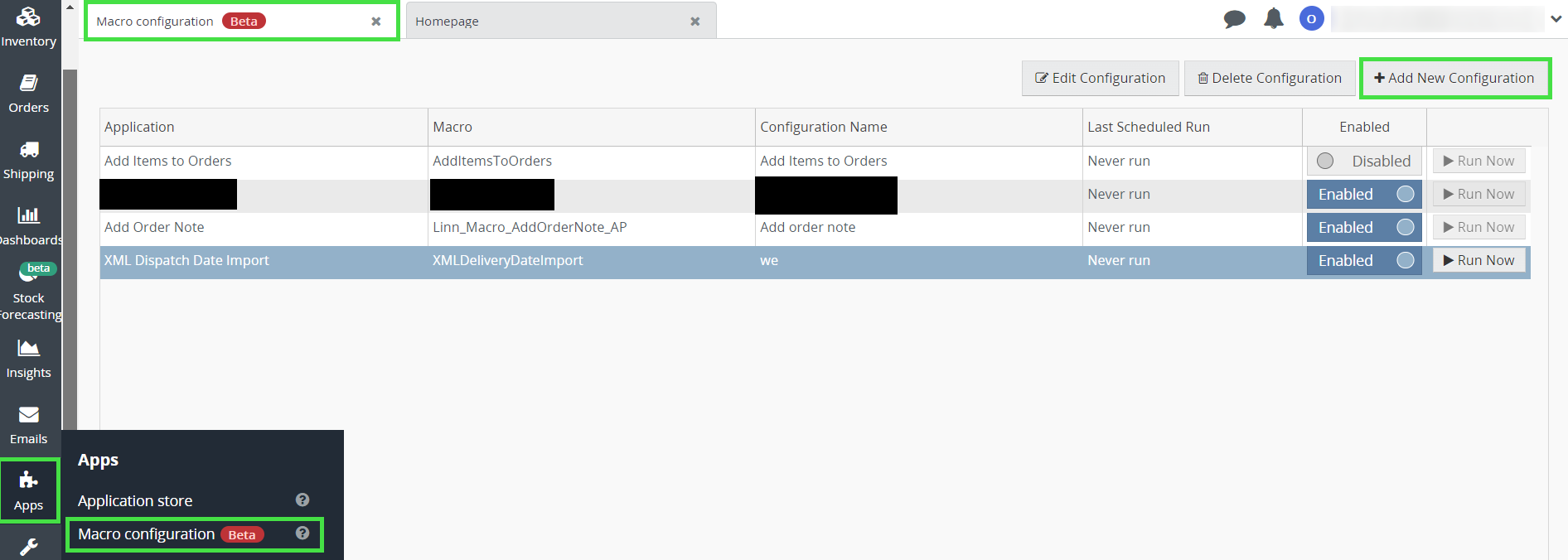 1. &#x20;Go to *Apps > Macro Configuration* and click  <mark style="color:purple;">+ Add new configuration.</mark>